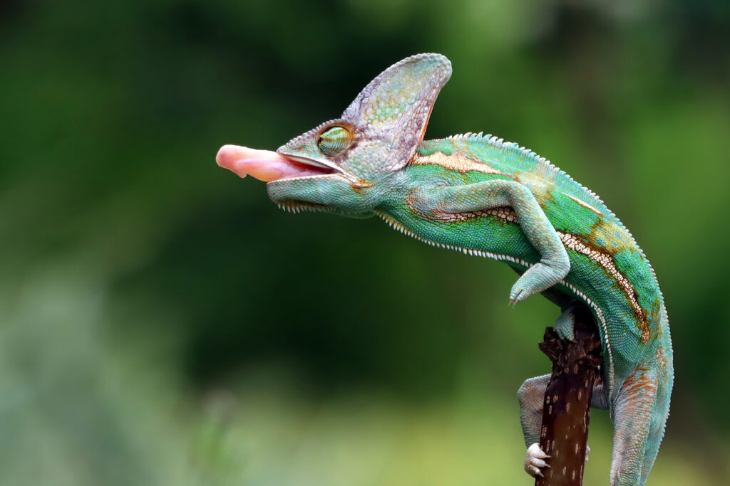 Úder jazyka chameleona trvá méně než dvě setiny sekundy. Délka jazyka přitom zhruba odpovídá délce těla – u větších druhů to může být i přes třicet centimetrů. Rychlost nevzniká svalovou silou, jak bychom čekali, ale principem podobným kuši nebo pružinovému mechanismu: energie se nejprve akumuluje v elastické tkáni a pak se naráz uvolní. Sval samotný by takové zrychlení nedokázal vyvinout. Chameleon tak má k dispozici biologickou zbraň, která funguje na fyzikálním principu, nikoli jen na síle.